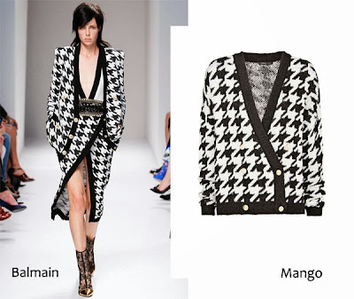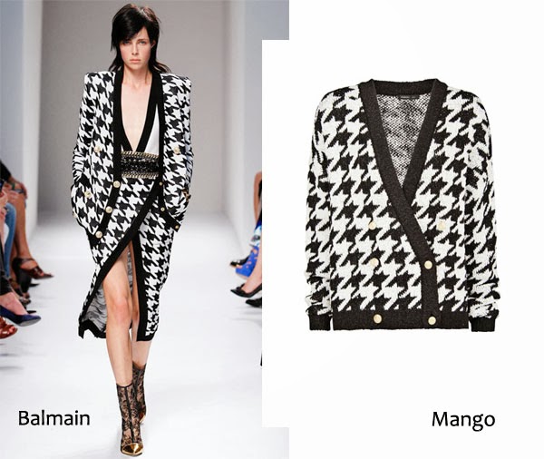 El otro día os hablabamos de la pata de gallo como tendencia y ahora vemos esta chaqueta con botones redondos, grandes y dorados de Balmain clonado por Mango.