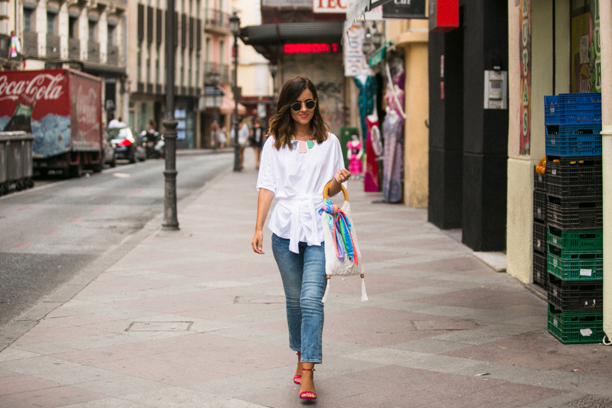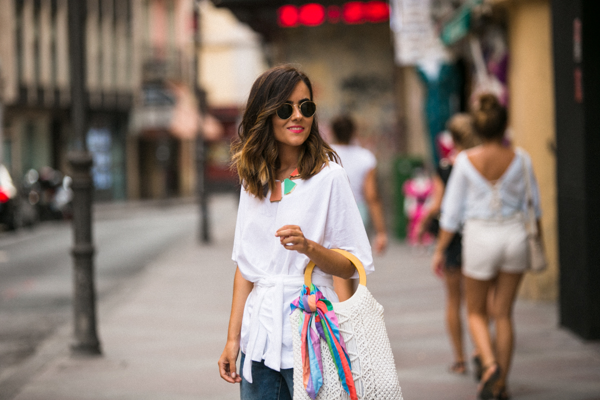 Y para completar el look, un bolso de macramé de Women Secret y tendrá 10 años… seguro. Le he añadido un pañuelo muy colorido de Zara al asa del bolso. Collar de Zara pero de hacer años y sandalias fucsia de Massimo Dutti de estas últimas rebajas. Las gafas ya me las habéis visto muchas veces, el modelo Round Metal de Ray-Ban, son muy cómodas y combinan con todo.