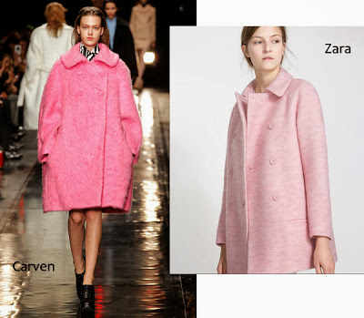 Zara ha clonado el abrigo voluminoso rosa intenso de Carven, el clon no es tan voluminoso y el color no es tan intenso pero huele a Carven sin duda alguna.