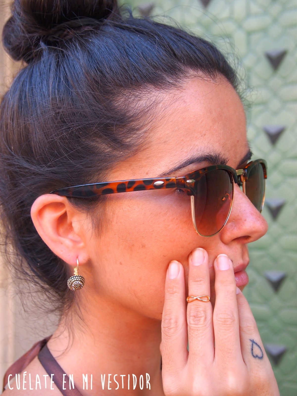 Llevo un anillo midi que me regalaron hace un tiempo pero aún no lo había sacado en ningún look, los pendientes me enamoraron, son de Sfera y las gafas son de Stradivarius, una imitación Ray Ban.