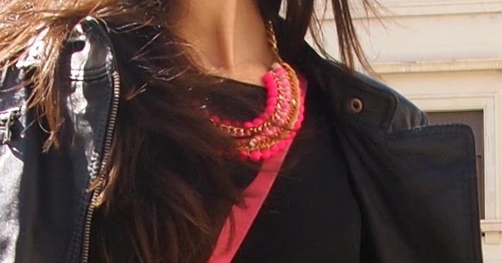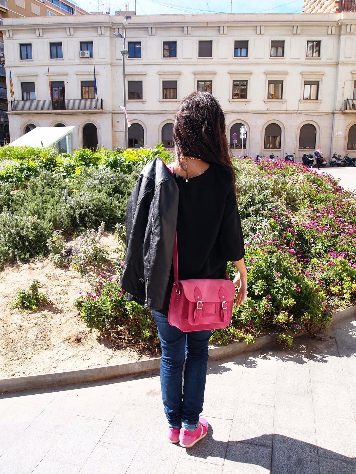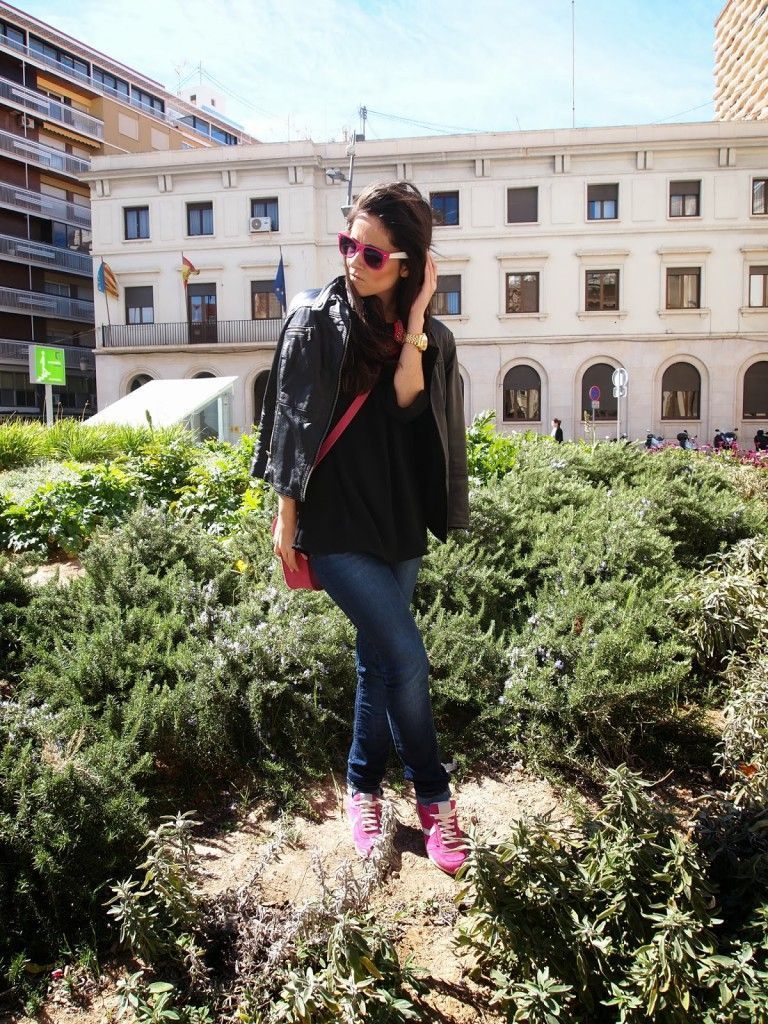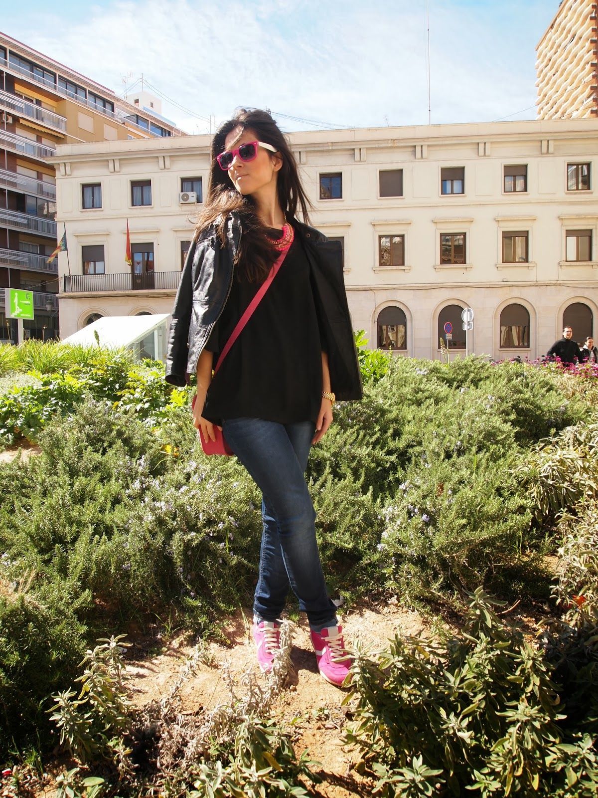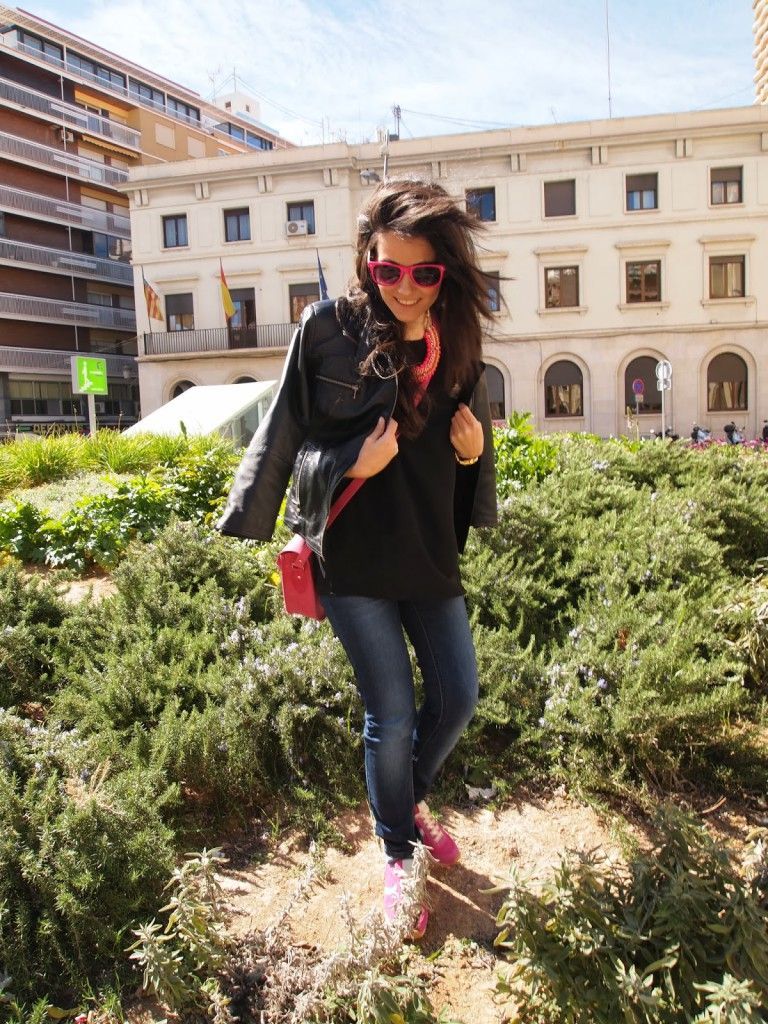 Los complementos los elegí de color Pink, collar, satchel y zapatillas ¿qué os parece? En color negro elegí la camiseta de manga francesa de Mango junto a la biker de Zara negra también. La unión de estos dos colores tan diferentes como el día y la noche son los jeans que llevo modelo skinner de Easy Wear.