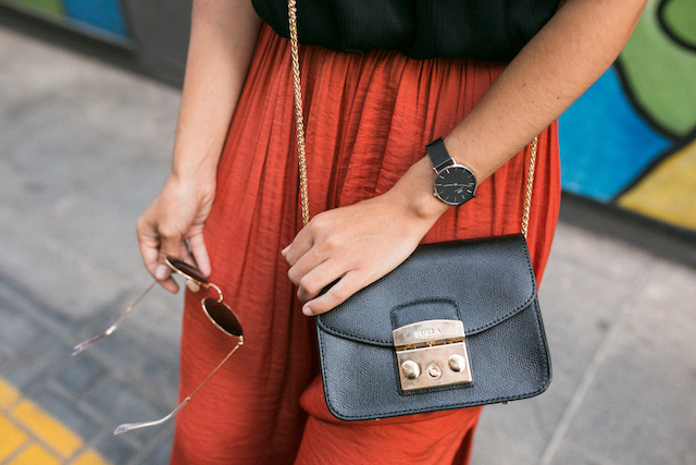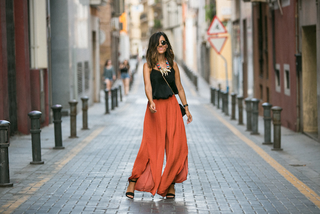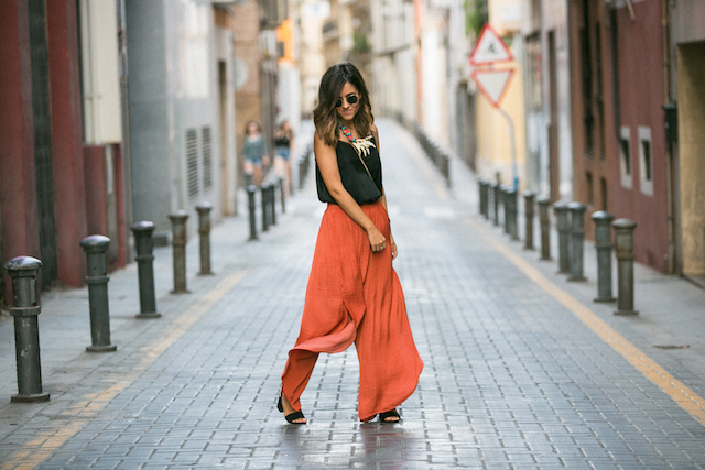 Los pantalones naranja son de Oysho, no llegaron a rebajas pero de nueva colección están en color verde, qué os parece? Los he combinado con un top lencero negro de Zara que podéis conseguirla ahora de rebajas. Los complementos que llevo son muy básicos; sandalias negras de Pull and Bear y bolso negro de Furla. He añadido un collar de Bimba & Lola para darle un toque de color a los complementos. Las gafas de sol de Ray Ban modelo Round Metal son lo más, no me las quito últimamente, son un básico que siempre llevo en el bolso.