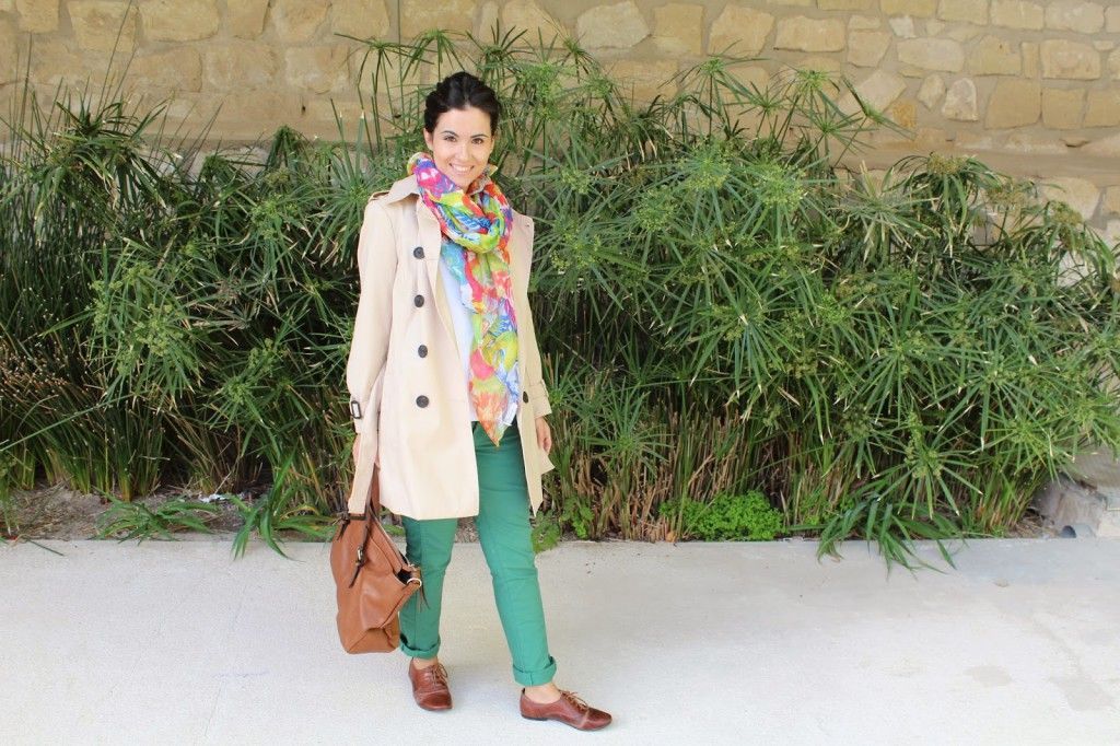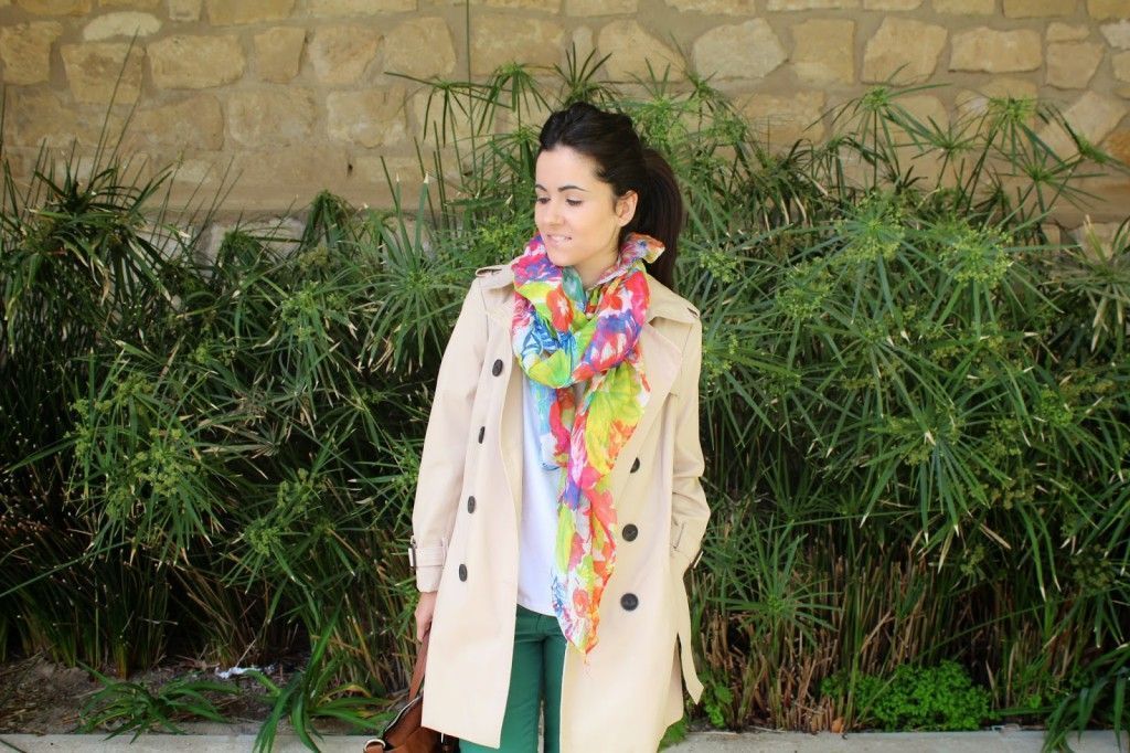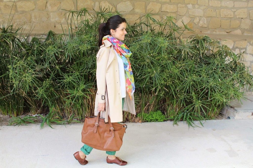 Los combino con una camiseta básica blanca de Zara, un pañuelo con estampado floral de Zara, unos bluches marrones de Carlos Reula y la trench de Stradivarius. El bolso es de Zara, reloj dorado de Massimo Dutti, pulseras El joyerito, Charlotte’s Dream y Tous. ¿Cómo combinaríais vosotras estos pantalones verdes? Ahhhh y necesito cambiar los bluchers, estos están los pobres que dan pena porque los utilizo mucho. Son mi calzado todo terreno y estos de Carlos Reula los tengo ya unos años ¿me aconsejáis algunos? Me tienen que durar varios años, eh jejeje… He visto unos en Pikolinos, muy monos del mismo estilo ¿alguna ha probado el calzado de Pikolinos? Quisiera saber que tal es la calidad-precio de esta marca.